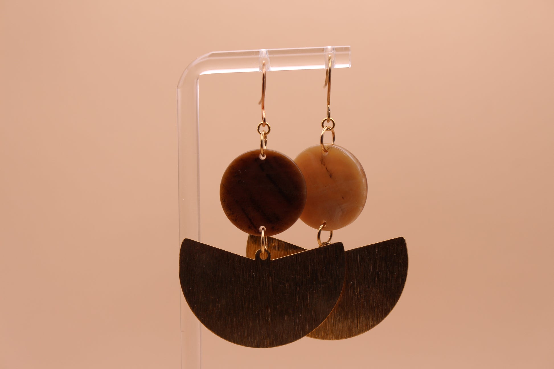 Materials: 18k Gold Plated Earring Hooks, Gold Plated Findings, Brown Acetate Coin & Brass Charms